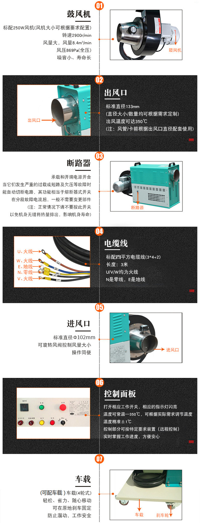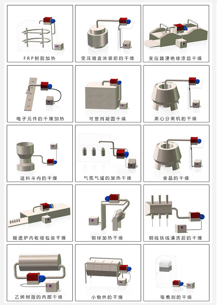 廣泛應(yīng)用于包裝機械、食品加工、醫(yī)療機械、印刷、汽車、材料熱處理、橡膠制品等行業(yè)的干燥升溫。